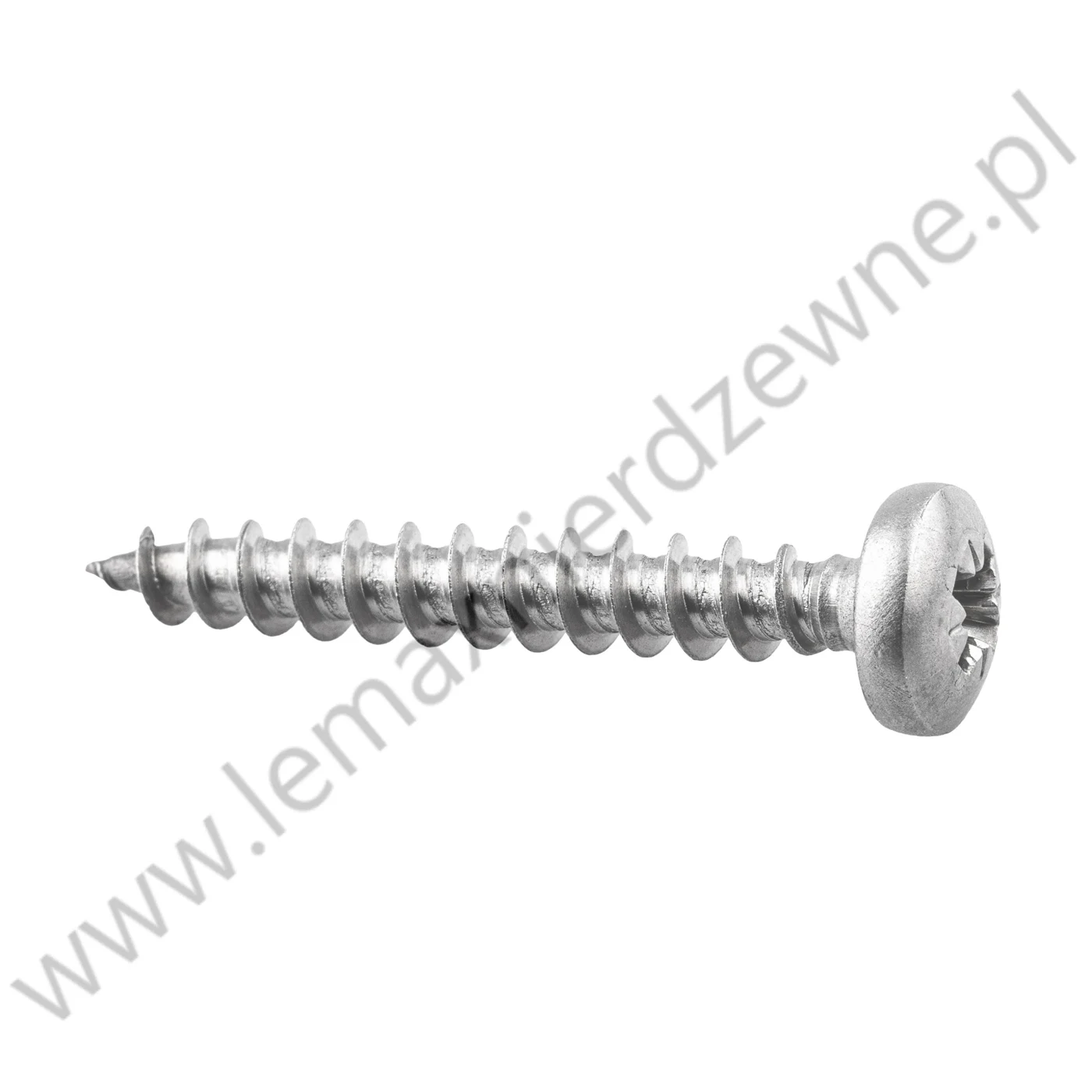 To element złączny wykonany ze stali nierdzewnej, wyposażony w łeb płaski soczewkowy oraz nacięcie krzyżakowe (PH). Zapewnia trwałe, a zarazem estetyczne połączenie elementów drewnianych i drewnopochodnych, gwarantując odporność na korozję i długą żywotność.