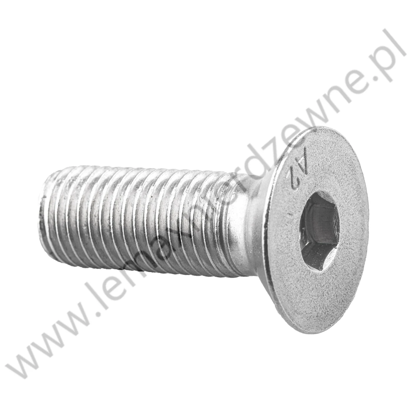 To element złączny wykonany ze stali nierdzewnej, wyposażony w łeb stożkowy i gniazdo imbusowe.